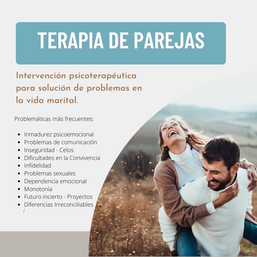 La Terapia de pareja consiste en un tratamiento psicológico que se realiza entre dos personas que mantienen una relación íntima y amorosa, que se encuentran atravesando por dificultades en su convivencia, comunicación y vida conyugal que desean mejorar, y un psicoterapeuta formado, quién será el encargado, de facilitar los medios necesarios con para ayudarles a identificar y ser conscientes del problema, mejorar su comunicación y resolución de los mismos, aumentando así su bienestar en su vida íntima conyugal.