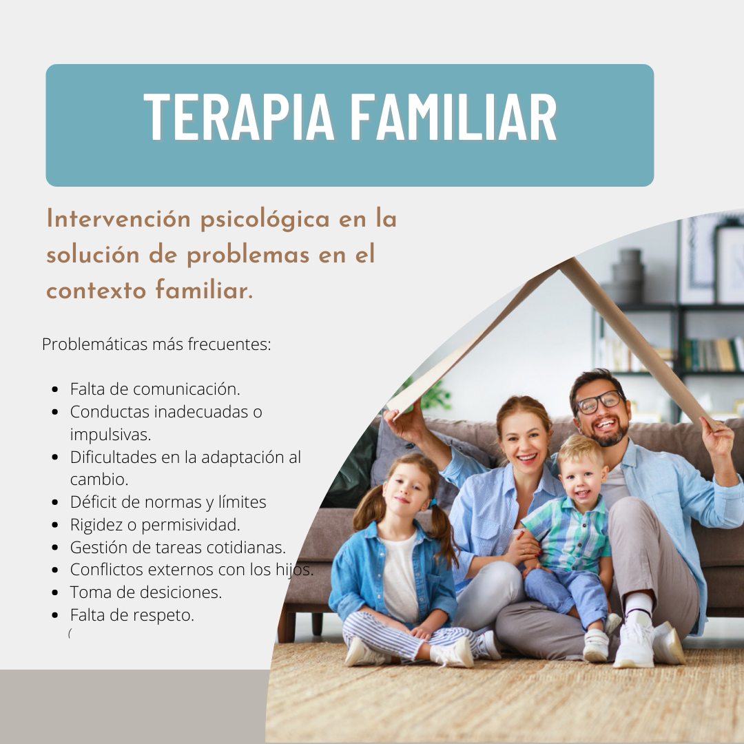 La terapia familiar es un procedimiento psicológico cuyo objetivo es intervenir en problemáticas que se dan dentro de un contexto familiar, en esta sesión interviene los miembros de la familia nuclear/ o extendida, involucrados en la problemática motivo de consulta y que tienen la necesidad de mejorar su cuyuntura actual, y el profesional calificado quién intervendrá en la modificación de patrones conductuales, dinámicas relacionales interfamiliares, que ayuden al mejoramiento, bienestar y armonía de al familia.